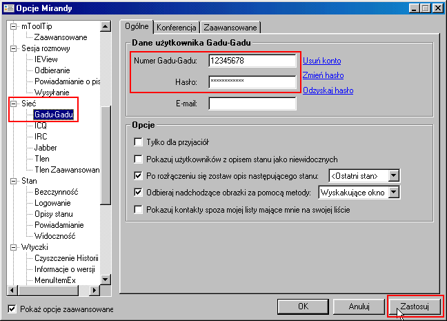 Do skonfigurowania swojego konta GG wystarczy wpisanie poprawnego numeru oraz hasła w gałęzi opcji Sieć -> Gadu-Gadu.