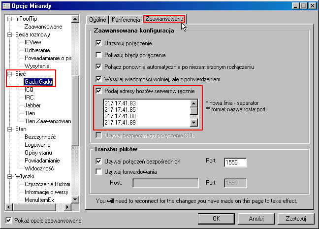 W przypadku problemów z połączeniem można ręcznie ustawić adresy IP w liście dostępnych serwerów z zakładki Zaawansowane.