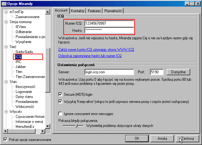 Sieć ICQ konfiguruje się podobnie jak pozostałe podając numer i hasło w gałęzi opcji Sieć -> ICQ. |