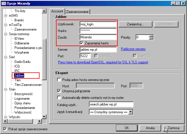 Konfiguracja pozostałych protokołów (Jabber/Spik, ICQ, IRC)