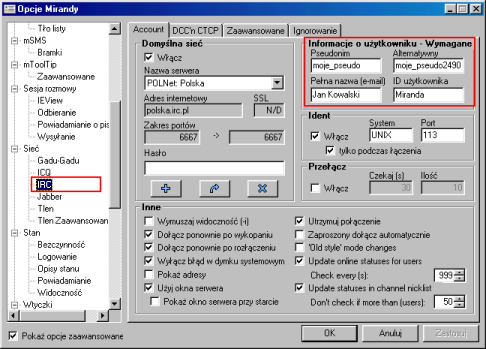 Konfiguracja sieci IRC, o ile nie podaliśmy żadnych danych podczas pierwszego uruchomienia Mirandy, może być ustalana w gałęzi opcji Sieć -> IRC. Możemy tam też ustalić, z którego serwera domyślnie będzie korzystał nasz protokół. |